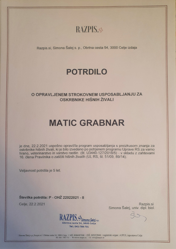 Imam potrdilo o opravljenem strokovnem usposabljanju za oskrbnike hišnih živali (UVHVVR certifikat) in licenco za markerja s strani Kinološke zveze Slovenije.